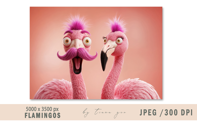 Add a splash of humor and vibrant color to your projects with this Funny 3D Cartoon Flamingo Couple Illustration. This high-quality digital art features a hilarious duo: a shocked flamingo sporting a giant purple mustache and crazy hair, alongside his quirky partner.