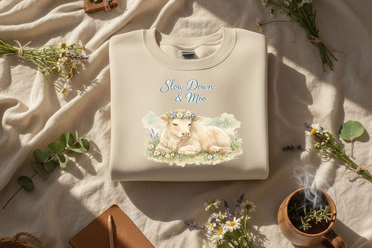 This “Slow Down & Moo” PNG features a gentle watercolor cow resting in a soft meadow with delicate florals and a dreamy cottagecore feel. Perfect for creating cozy apparel, farmhouse décor, and heartwarming gifts.