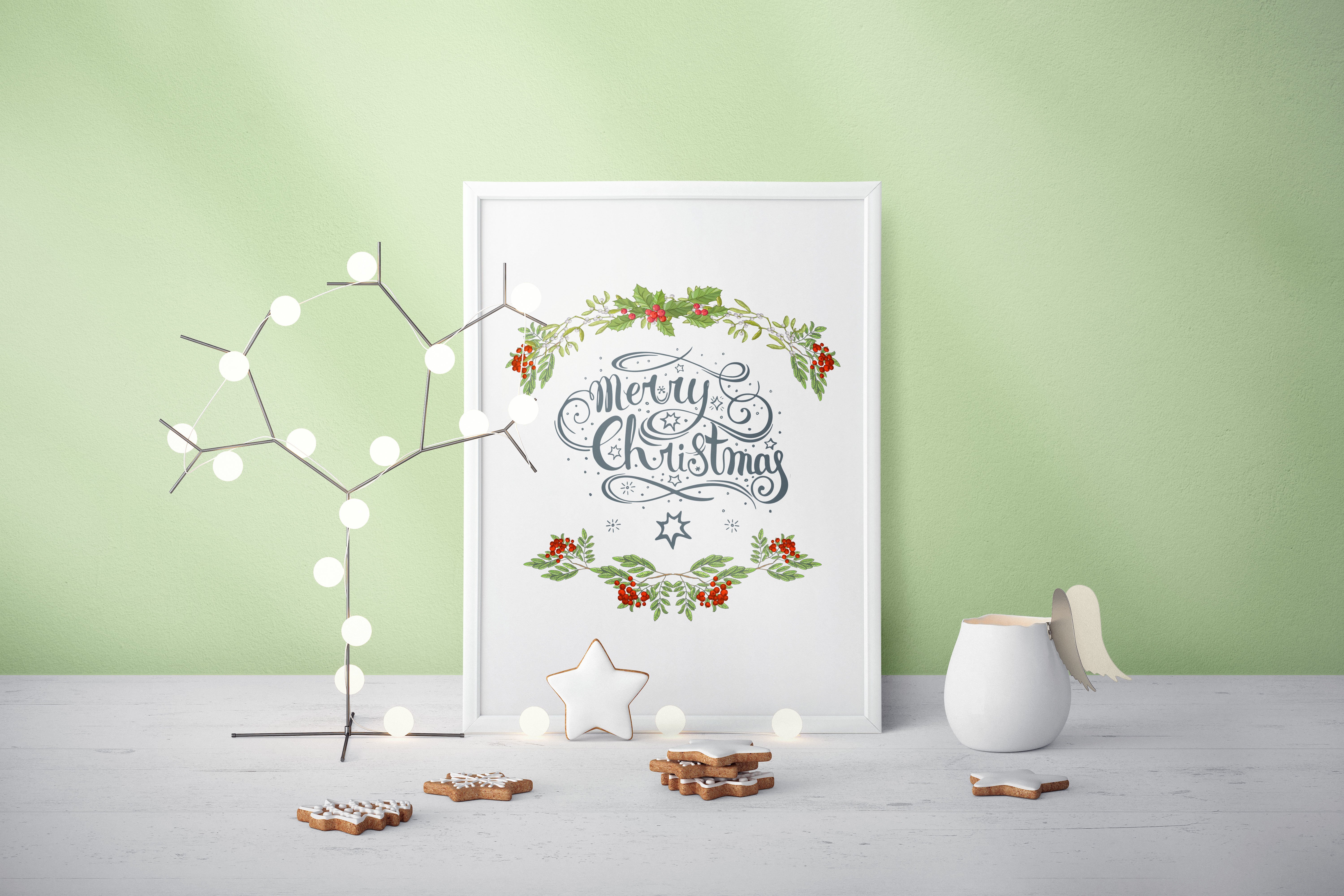 1. A wreath-shaped Christmas frame made from hand-drawn holly, mistletoe and rowan bunches.