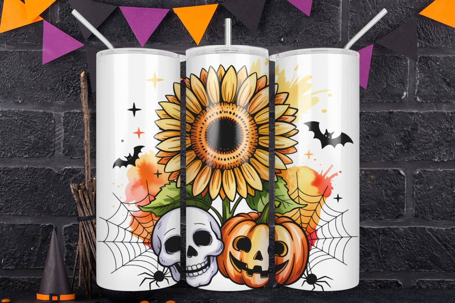 Skull Pumpkin and Sunflower Watercolor Skinny Tumbler Wrap example image 1
