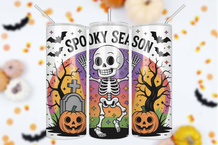 Get into the Halloween spirit with this Spooky Season Skeleton Skinny Tumbler Wrap. Featuring cute skeletons, spooky season text, and festive Halloween accents, this wrap is perfect for DIY sublimation, personalized tumblers, Halloween gifts, and spooky-chic decor projects.