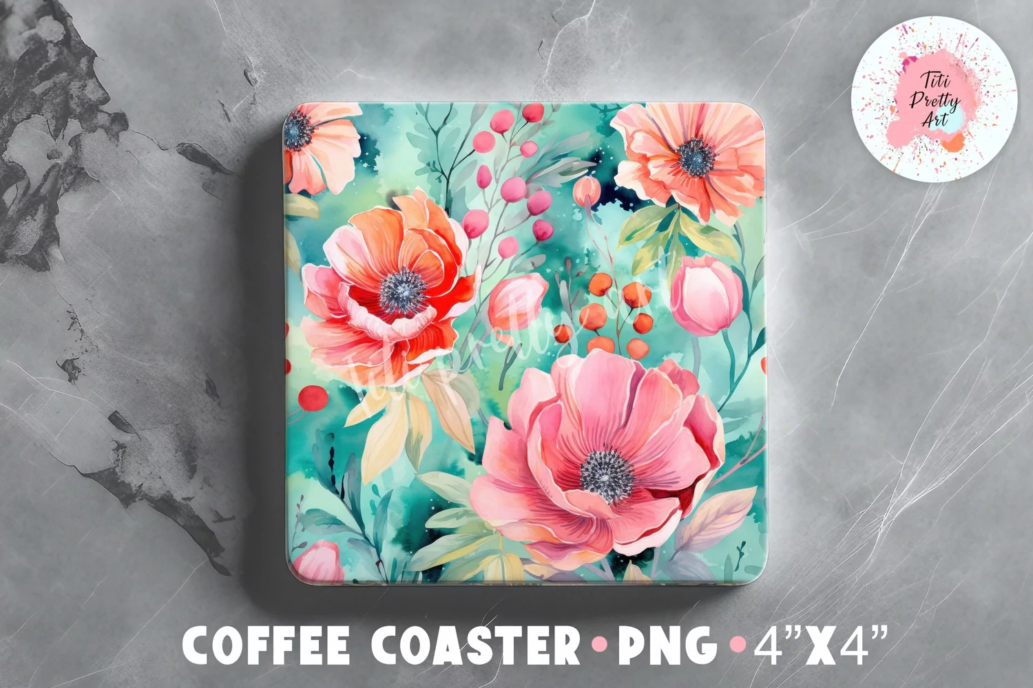 Floral Square Coaster, Coffee Square Coaster Sublimation Png,  Square Coaster Png