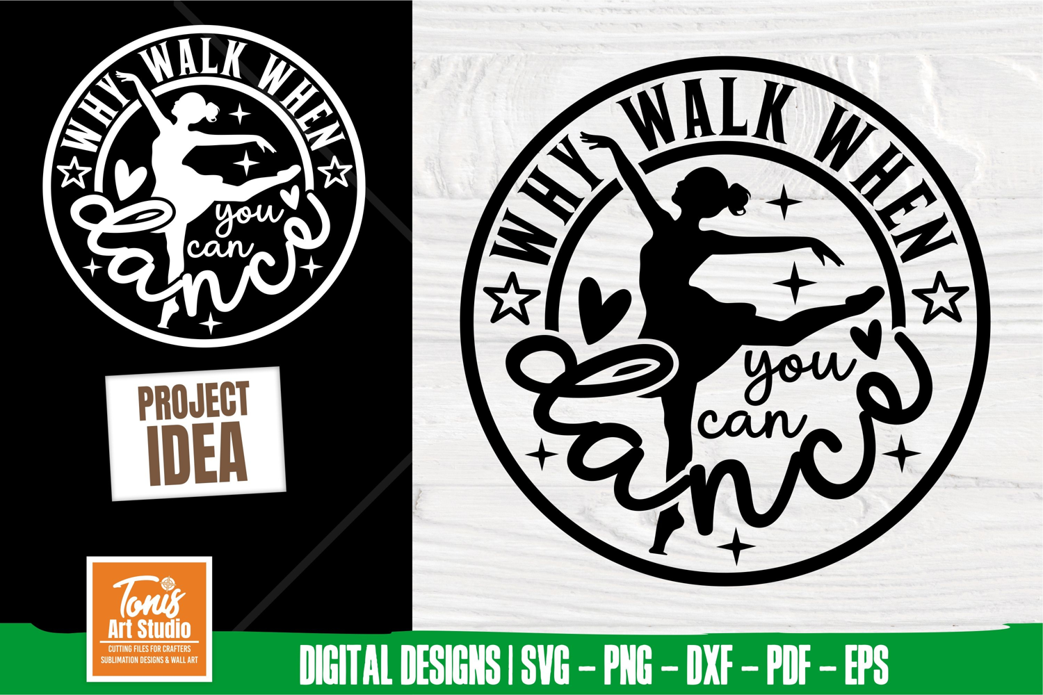 ✔ A Beautiful Dance SVG Round Sign Design, with the quote: Why Walk When You Can Dance. Digital Download perfect for creating round wall signs, dance studio decor, t-shirts, hoodies, sweatshirts, tote bags, decals, and motivational gifts for dancers, dance moms, and dance teachers. This elegant circular design features a graceful dancer silhouette combined with flowing script and bold lettering, making it ideal for dance rooms, studios, classrooms, and modern home decor. Designed for smooth, clean cutting with Cricut, Silhouette, and other cutting machines. Suitable for heat transfer vinyl, adhesive vinyl, print-and-cut projects, and DIY crafting. Digital product only; no physical item will be shipped.