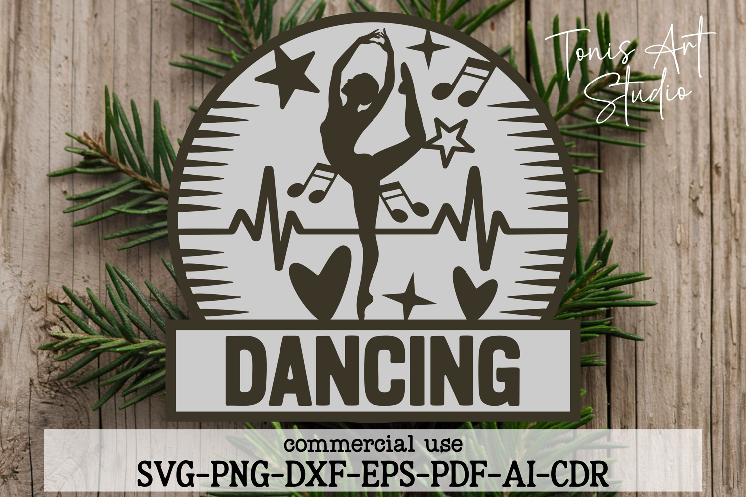A Beautiful Dance SVG Design, featuring a round dance sign with an elegant dancer silhouette, heartbeat line, music notes, stars, and heart elements, completed with a bold “DANCING” nameplate. Digital Download including both 1-layer and 2-layer versions, perfect for creating t-shirts, hoodies, sweatshirts, nursery decor, kids room wall art, studio signs, decals, stickers, and laser-cut projects. Designed for Cricut, Silhouette, laser machines, vinyl cutting, sublimation, and print use. Ideal for dancers, dance studios, dance moms, and dance-themed spaces.