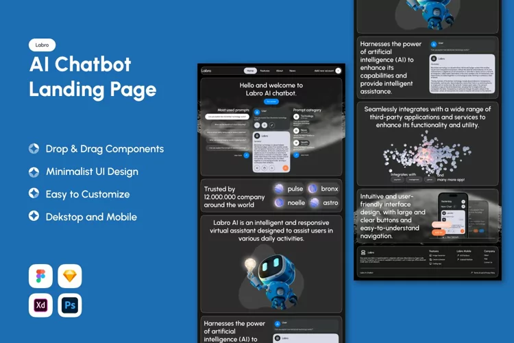 Labro is an AI chatbot landing page that makes users feel at home with its friendly and engaging design. Its interactive features and diverse response library make it a go-to landing page for users seeking quick and accurate responses. The design is visually appealing, with a focus on user engagement. The layout is intuitive, making it easy for users to navigate and find what they’re looking for. The interactive elements are designed to engage users, encouraging them to explore the AI chatbot’s capabilities.