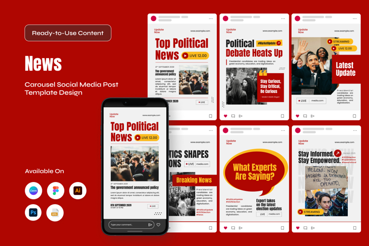 Present fast updates with style and professionalism using this editorial carousel pack. Designed with clean typography, subtle contrast, and visual hierarchy that enhances credibility perfect for news platforms, media agencies, and independent reporters.