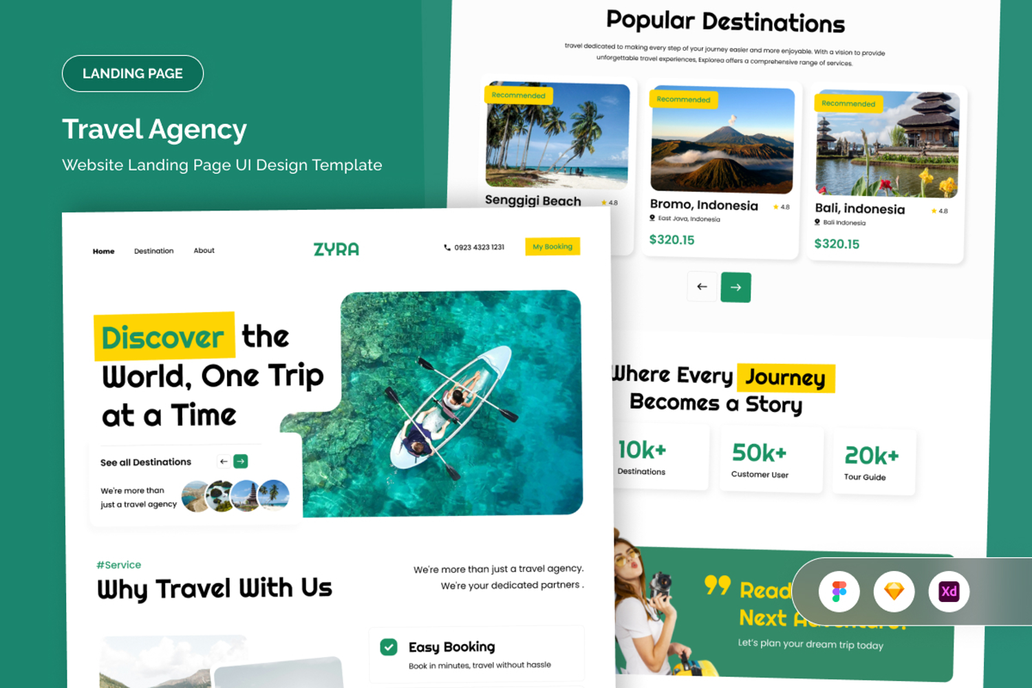 This Modern Tour & Booking Landing Page UI Kit delivers a joyful, contemporary design made for travel agencies and booking platforms that aim to connect emotionally with their users. Featuring vibrant imagery, rounded shapes, and an intuitive layout flow, it captures the excitement of travel while maintaining a professional and easy-to-navigate interface. This Kit is the perfect all-in-one solution for promoting destination highlights, special deals, or tour packages, inspiring exploration and instant booking.
