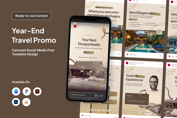 This premium carousel delivers a high-impact visual identity tailored for year-end travel campaigns. With its warm luxury palette, airy spacing, and bold headline typography, it creates an aspirational narrative that inspires viewers to explore exclusive travel deals. Subtle festive cues keep the holiday spirit alive while maintaining an elevated, editorial-style aesthetic.