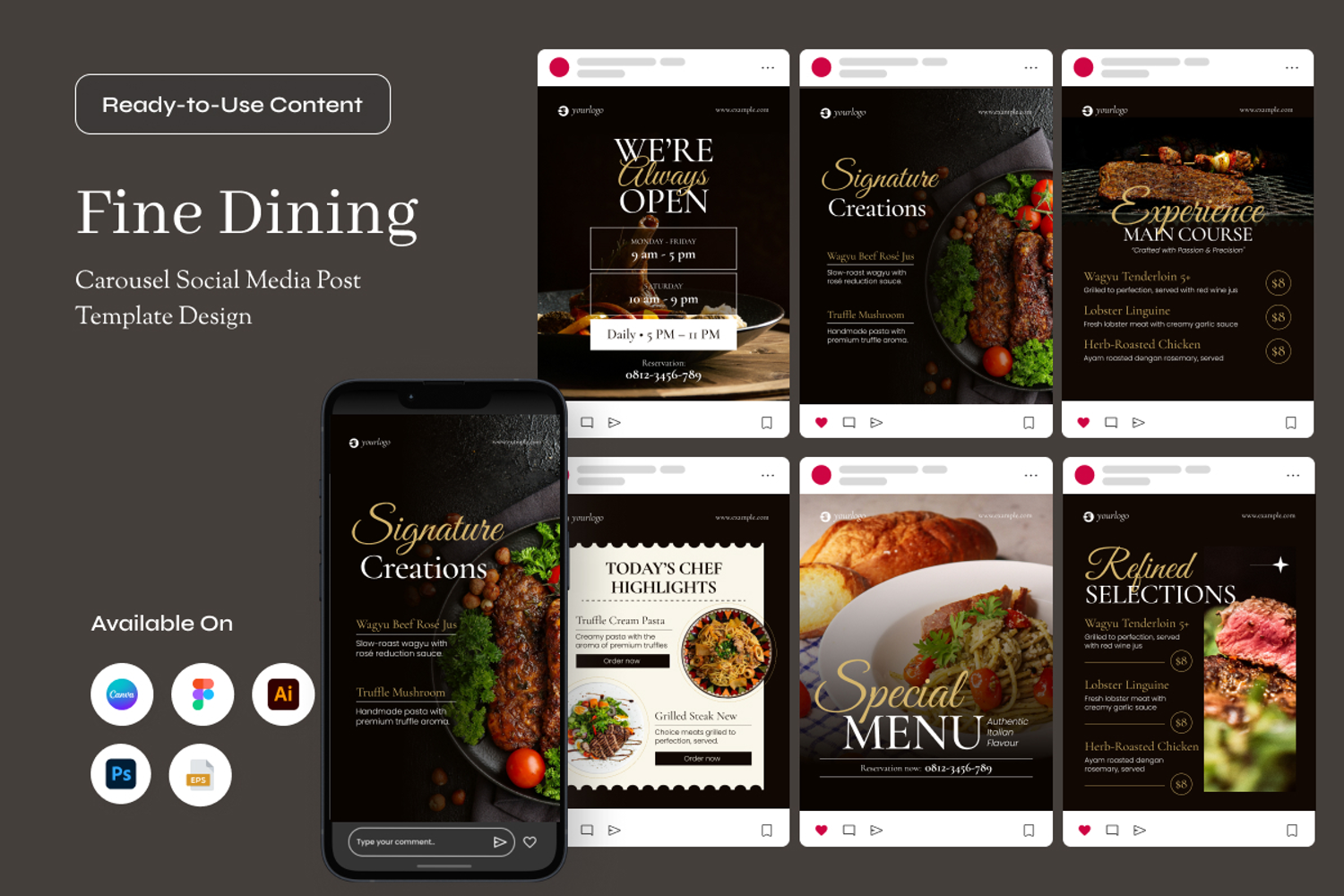 Perfect for fine-dining restaurants, hotel restaurants, culinary brands, and Michelin-level chefs, this carousel supports menu promotion, chef storytelling, and exclusive dining experiences. It allows brands to communicate elegance and value while maintaining a modern, professional presence across social media platforms.