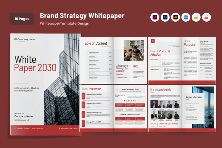 This whitepaper focuses on translating complex brand strategy into a clear, structured, and persuasive narrative. It perfectly balances visual authority and readability, making it ideal for presenting frameworks such as positioning, messaging hierarchy, and brand foundations in a highly professional format. The editorial-inspired layout ensures that your strategic insights are delivered with the clarity and impact they deserve.