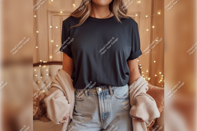 Fashion Clothing Casual Apparel Woman Model Female Denim Tshirt Mockup Black Tshirt