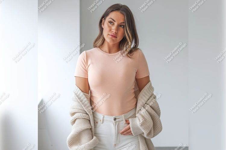 Tshirt Mockup Woman Peach Jeans Portrait Indoor Sweater Cardigan White Jeans
