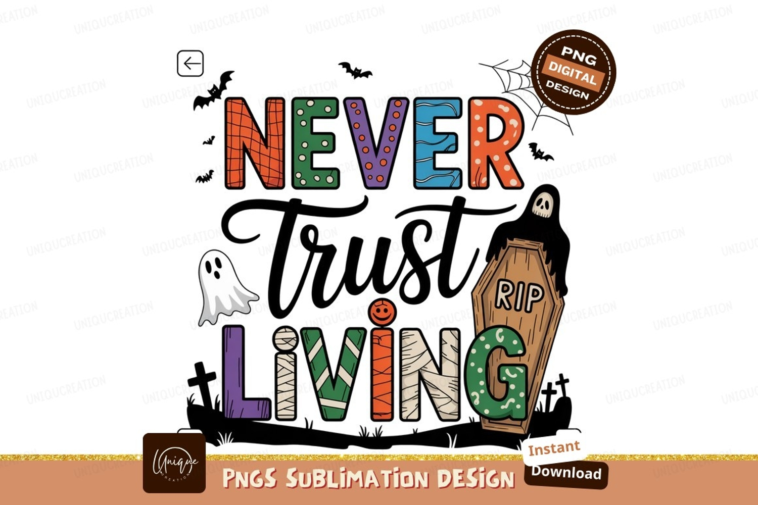 Keywords : halloween, never trust living, sublimation, png, graphic, vector, spooky, ghost, bat, spiderweb, tombstone, rip, mummy, grim reaper, cartoon, cute, funny, design, illustration, print, typography, lettering, holiday, october, dead, scary, creepy, party, festive, graveyard, tomb, coffin, graves, autumn, season, character, clipart