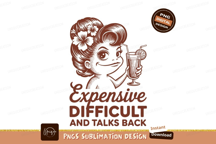 woman,cocktail,drink,funny,sarcastic,humor,expensive,difficult,talks,back,cartoon,illustration,retro,vintage,style,design,graphic,clipart,drawing,art,print,sticker,transparent,isolated,png,alpha,digital,artwork,character,hibiscus,flower,hair,updo,lemon,slice,straw,glass,tropical,vacation,beach,summer,party,fun,quote,saying,attitude