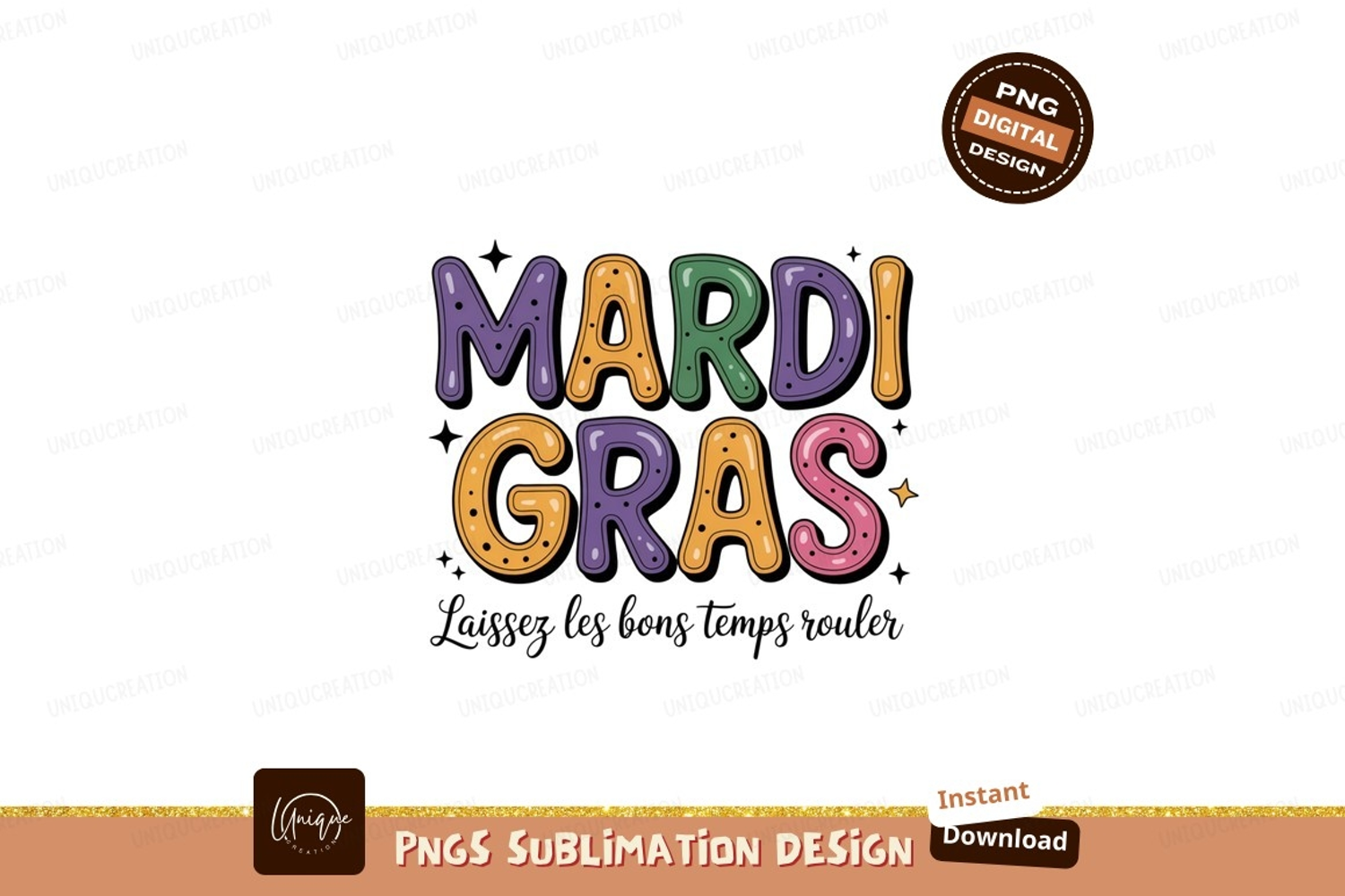 Mardi, Gras, festive, lettering, purple, green, orange, pink, yellow, stars, celebration, holiday, Louisiana, French, phrase, design, digital, PNG, SUBLIMATION
