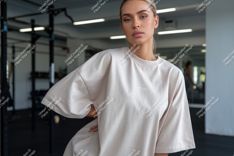 Similar Design Products to Woman wearing beige t shirt in gym image