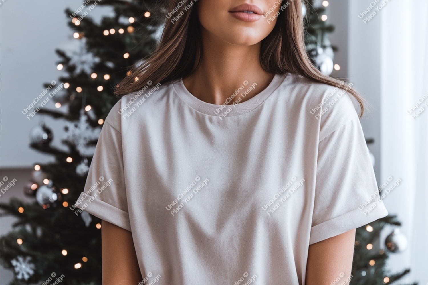 Woman wearing plain cream t shirt mockup image example image 1