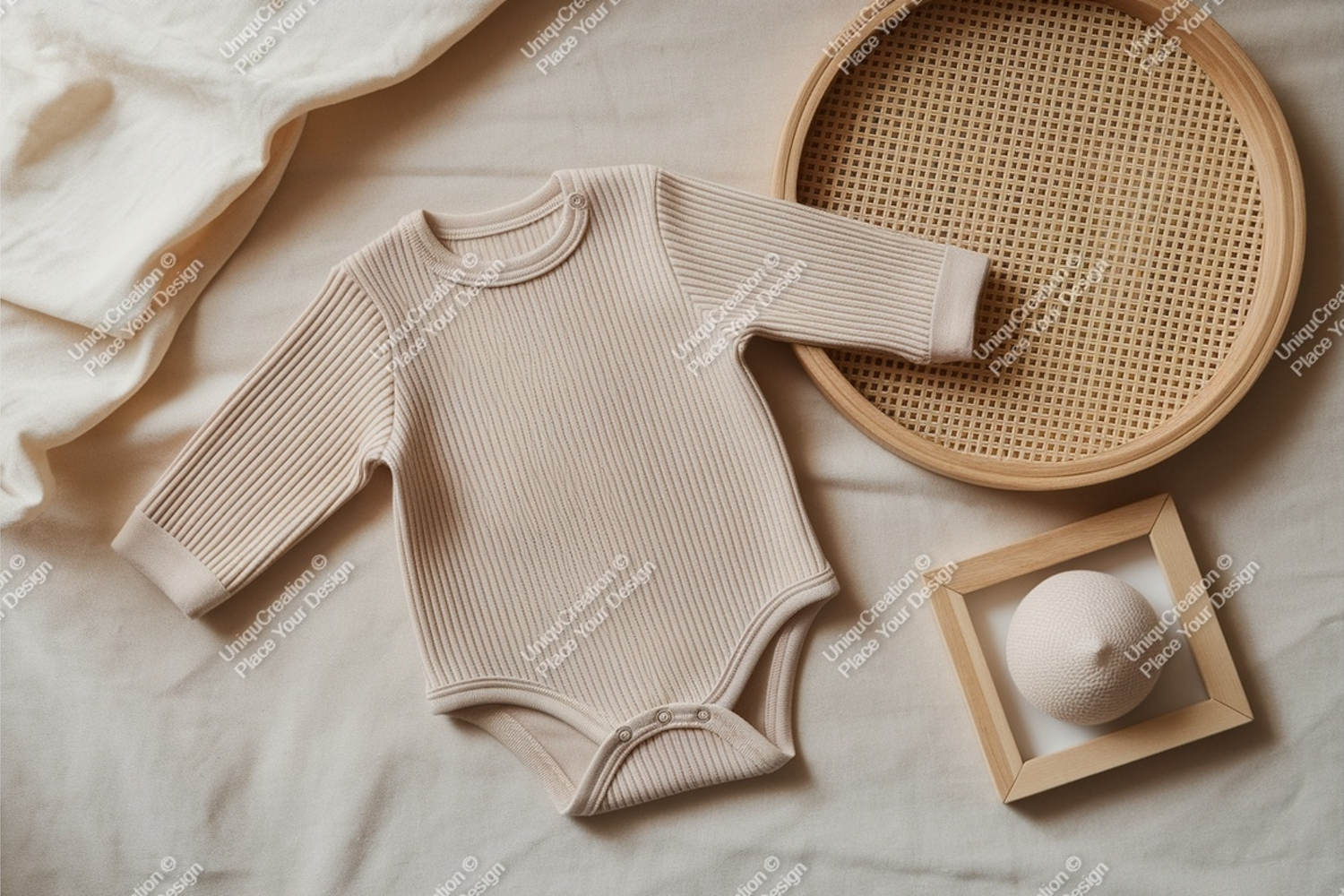 Tags: bodysuit,baby,clothing,beige,onesie,cotton,fabric,neutral,infant,apparel,newborn,soft,textile,minimalist,simple,clean,design,flatlay,mockup,layette,kids,garment,cute,child,tiny,small,unisex,organic,comfortable,gentle,pastel,indoor,studio,product,display,merchandise,sale,shop,store,online,ecommerce,retail,presentation,template,mock,up