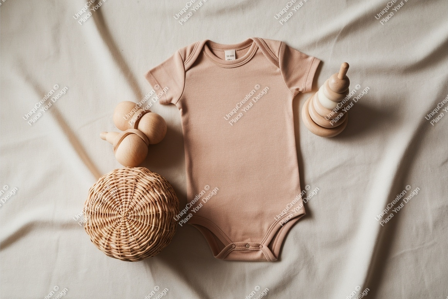 Beige baby bodysuit with wooden toys mockup example image 1