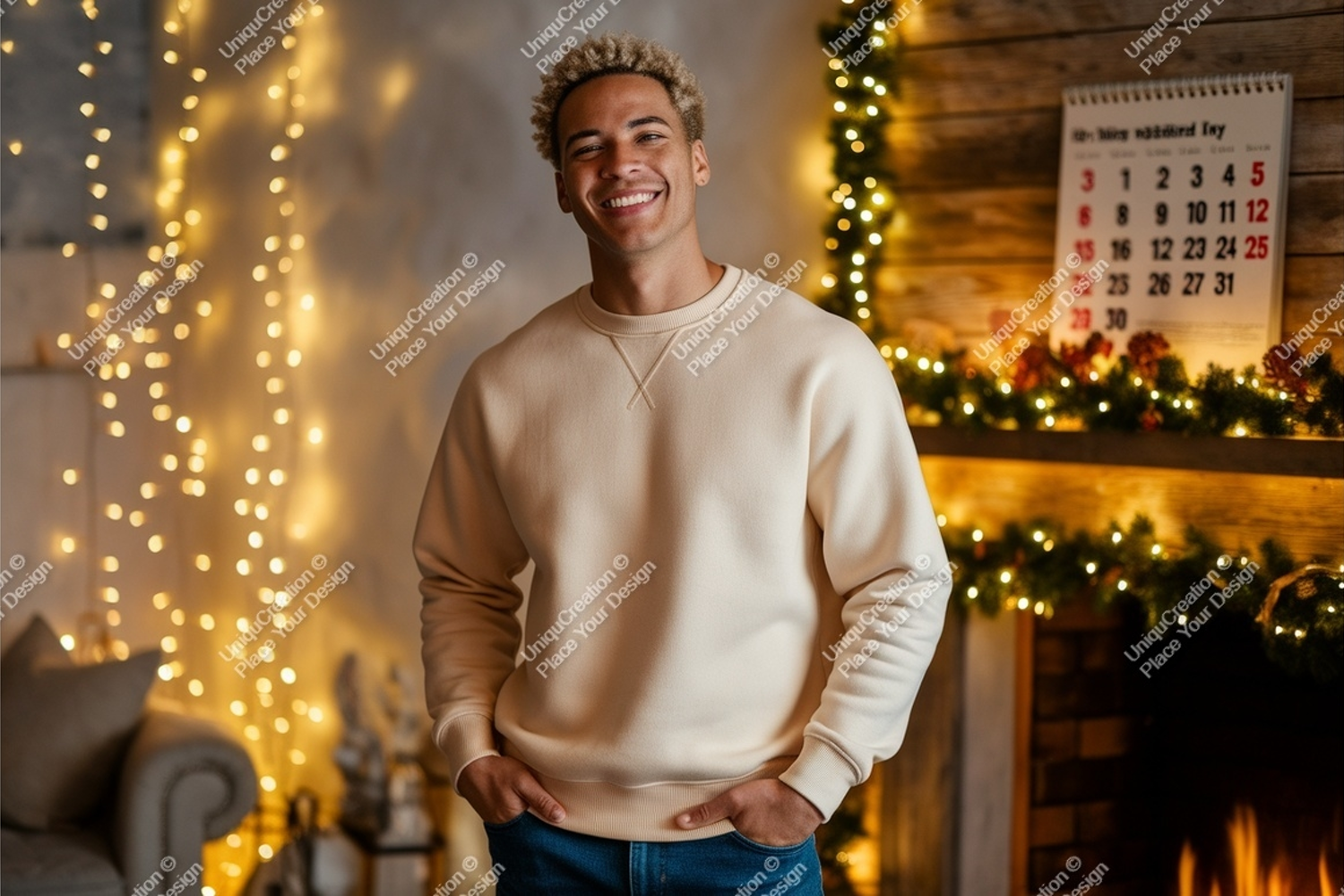 Tags: man, wearing, light, green, crewneck, sweatshirt, mockup, casual, clothing, apparel, fashion, winter, holiday, christmas, tree, lights, indoors, portrait, happy, smiling, confident, stylish, comfortable, warm, cozy, modern, studio, lifestyle, adult, male, person, garment, fabric, textile, design, template, display, branding, advertising, promotion, presentation, product, shot, front, view, full, body, upper, hands, pockets, jeans, denim, background, blurred, bokeh, soft, lighting, tones, festive, season, celebration, event, occasion, indoor, setting, home, interior, decor, furniture, pillows, bed, bedroom, living, room, focus, shallow, depth, field, natural, ambient, subtle, details, texture, material, cotton, blend, fleece, knit, long, sleeve, crew, neck, collar, stitching, seams, hem, cuffs, relaxed, fit, wear, everyday, loungewear, activewear, sportswear, athleisure, streetwear, urban, style, trendy, popular, fashionable, attractive, handsome, young, african, american, black, hair, short, facial, beard, stubble, clean, shaven, teeth, white, smile, joyful, expression, positive, emotion, friendly, approachable