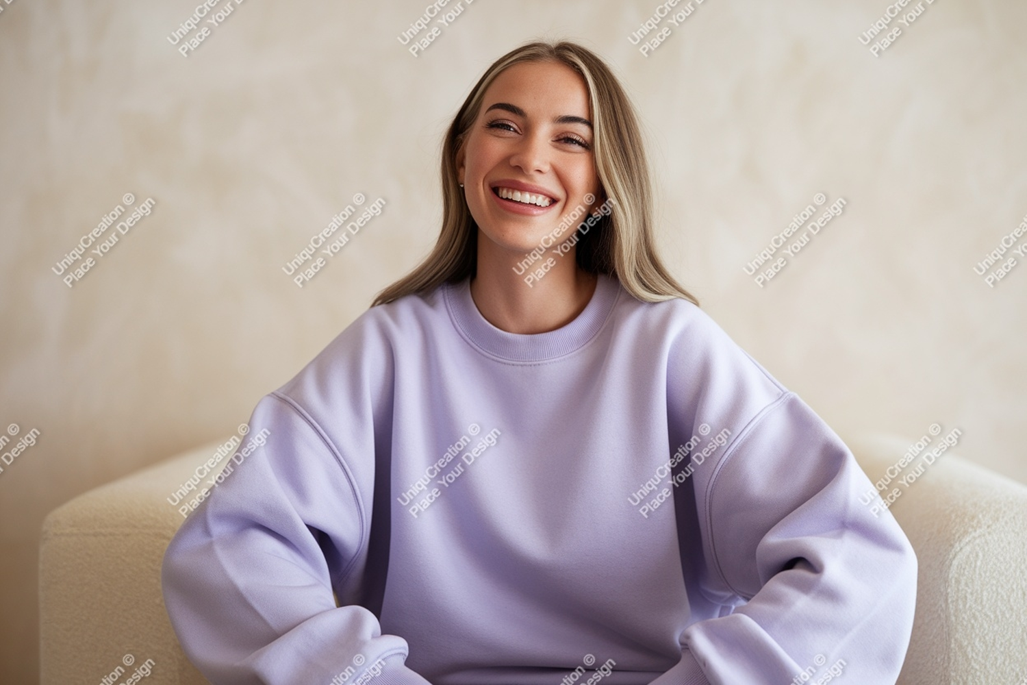 Similar Design Products to Young woman laughing wearing lavender sweatshirt happy