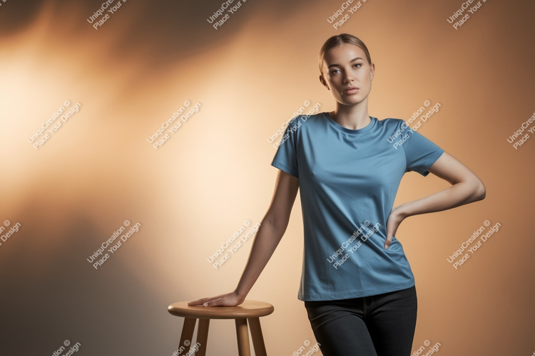 Fashion Black T-shirt Mockup Apparel Woman Background Blue Pants Stool