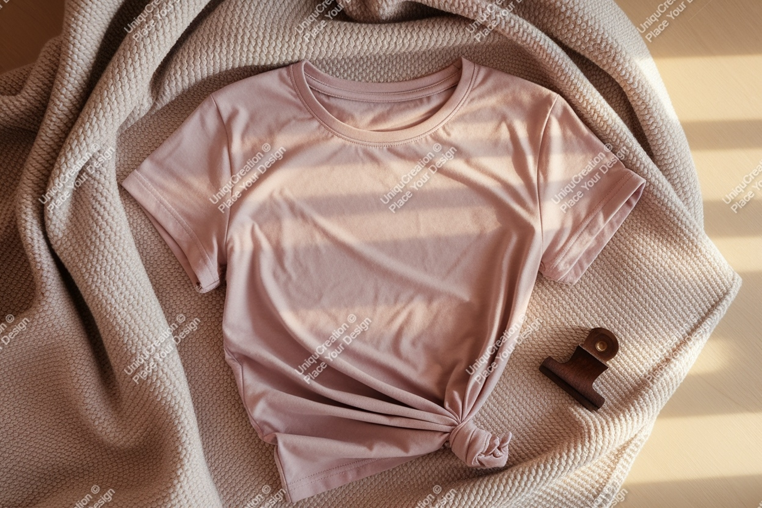 Pink t shirt mockup with knitted blanket apparel