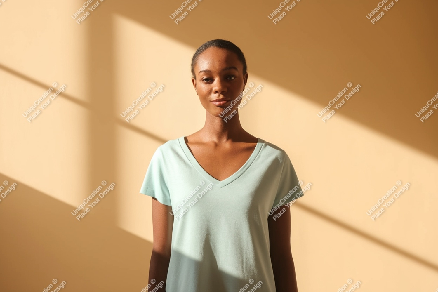 Similar Design Products to Woman wearing light blue v-neck t-shirt image