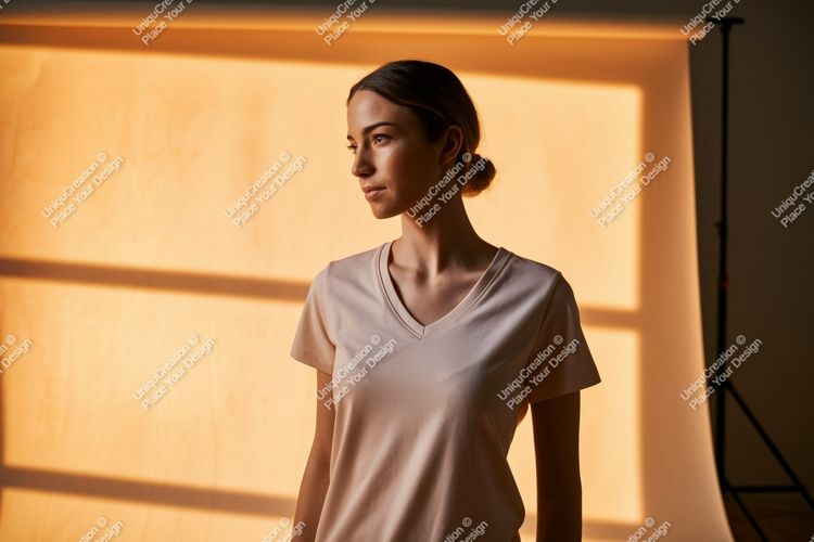 Light T-shirt Mockup Woman Studio Peach Portrait Lighting Plain V-neck