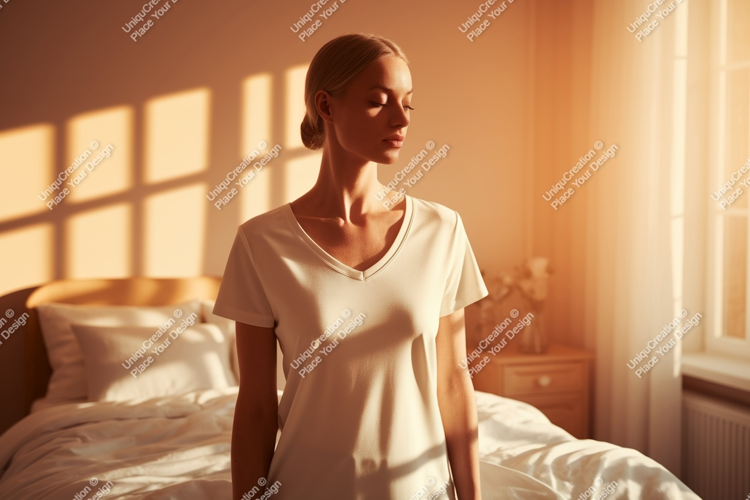 Similar Design Products to Woman wearing white t shirt in bedroom image