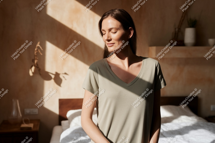 T-shirt Green Woman Peaceful Shadows Indoor Sunlight Relaxed Bedroom V-neck