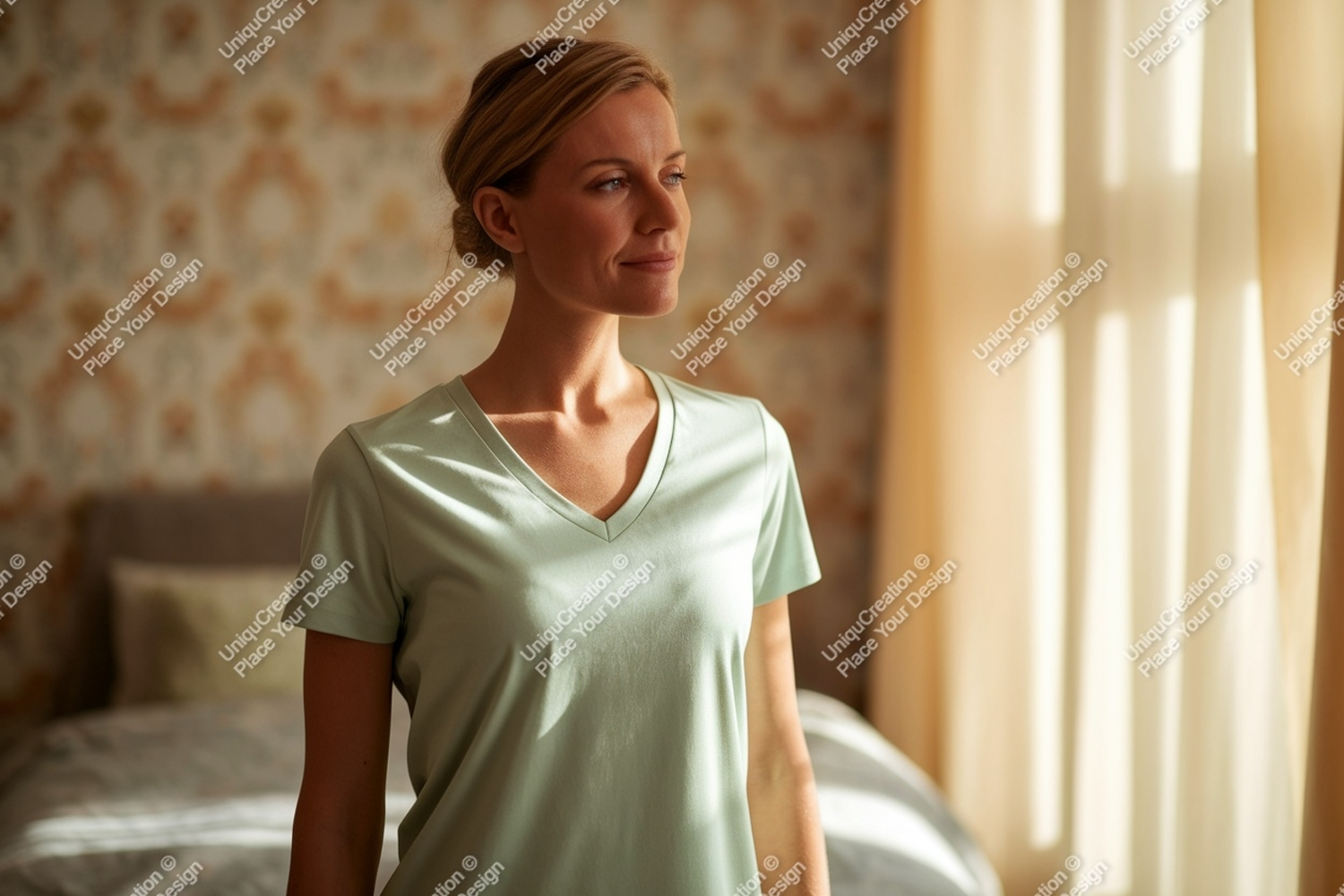 Similar Design Products to Woman wearing light green v-neck t-shirt casual