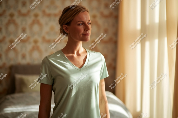 Light Fashion T-shirt Clothing Casual Green Mockup Woman Indoor V-neck