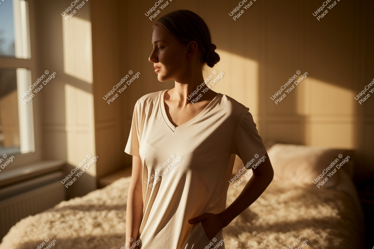 Light T-shirt Casual Mockup Woman Beige Indoor Sunlight Bedroom V-neck
