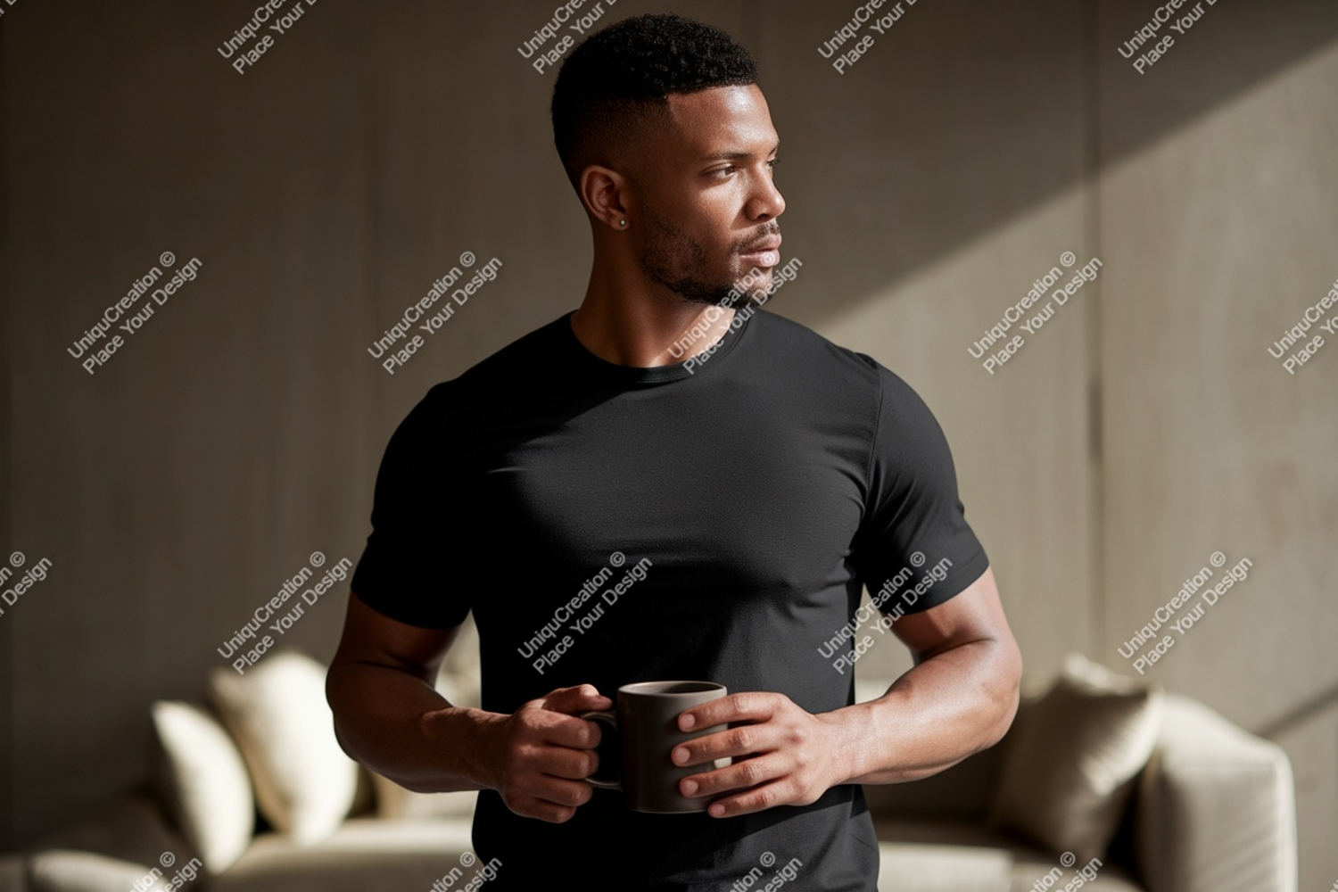 Man Black T-shirt Casual Mockup Portrait Holding Mug Indoor