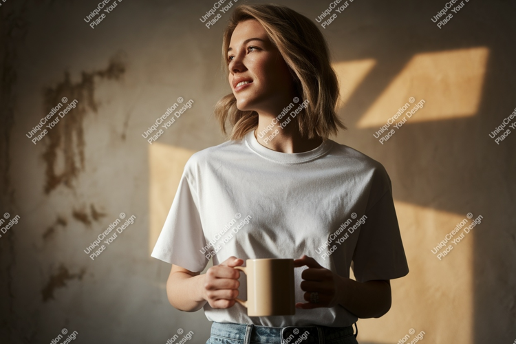 Shirt Clothing Casual Mockup Woman White Beverage Holding Mug T