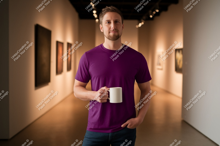 Man Art Clothing Casual Interior White Holding Mug Gallery Exhibition