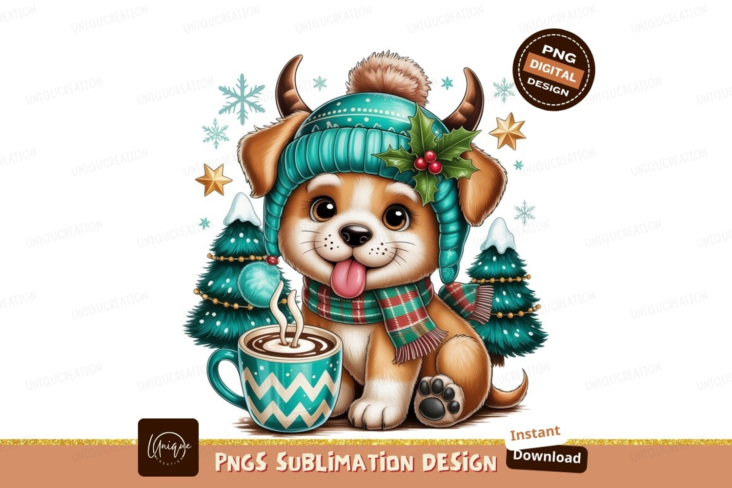 puppy, dog, festive, winter, christmas, hot, drink, mug, scarf, hat, trees, snowflakes, stars, cute, holiday, season, warm, cozy, beverage, Sublimation, PNG
