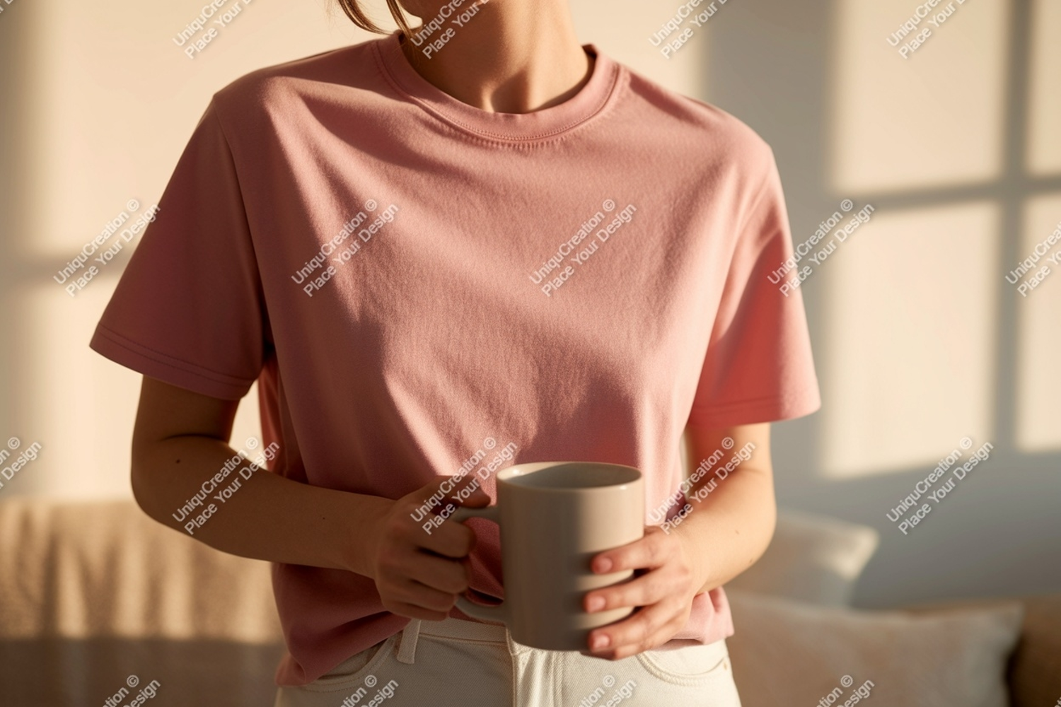 Similar Design Products to Woman holding mug wearing pink t shirt image