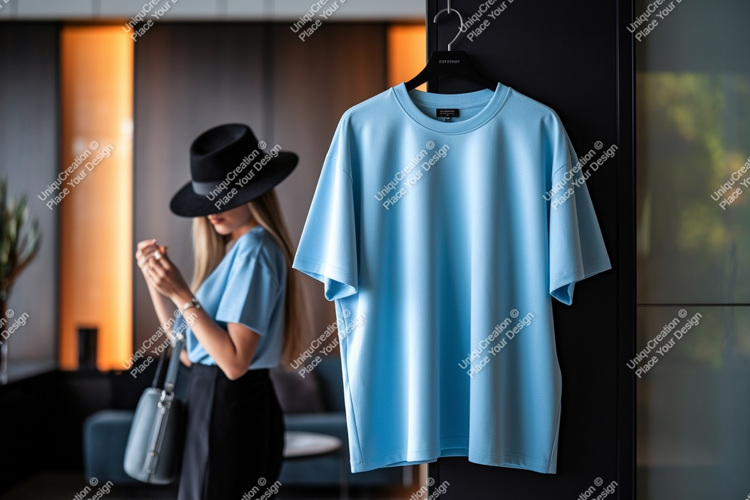 Similar Design Products to Format: Title: Light blue t shirt mockup with woman