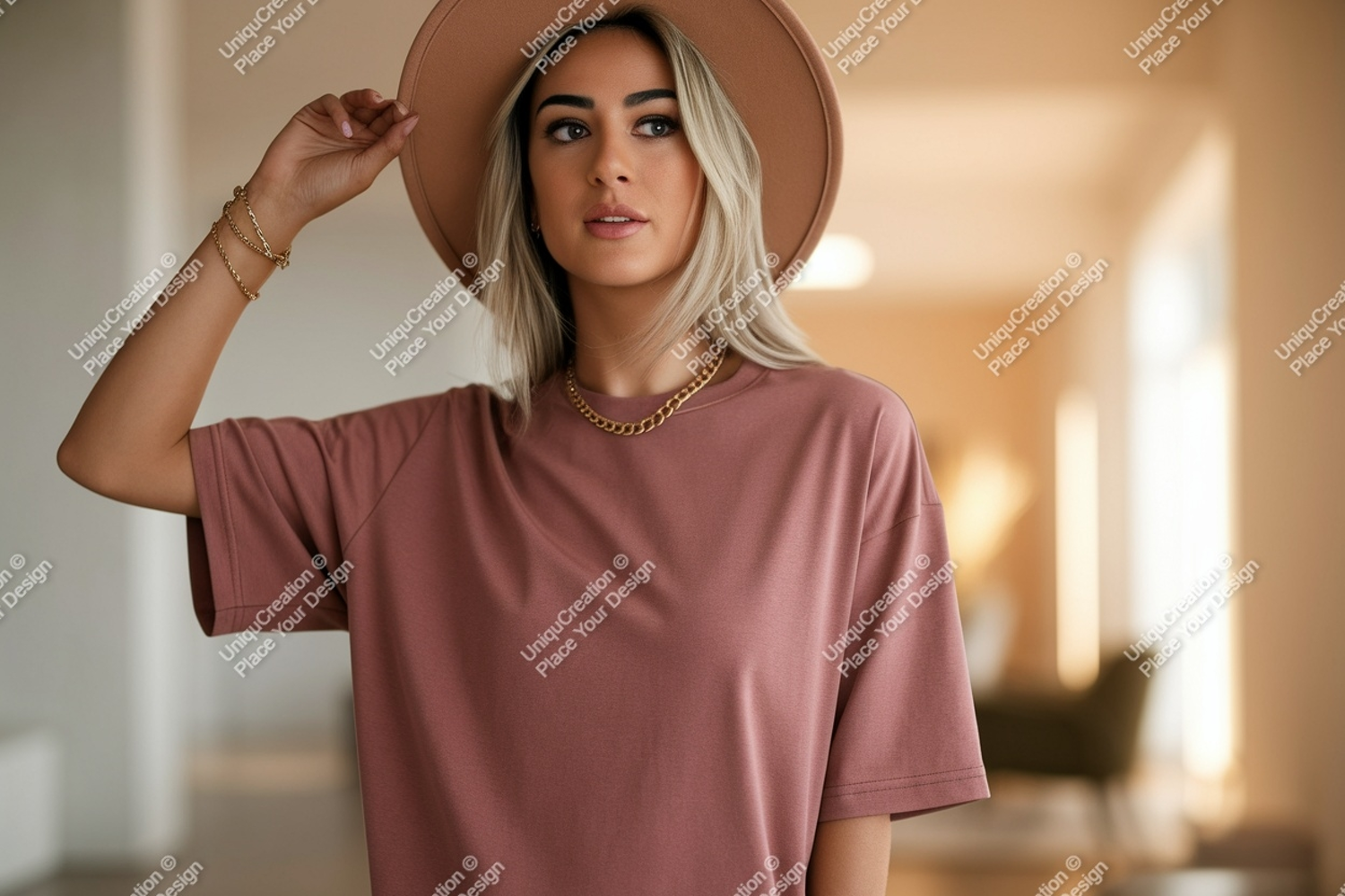 Fashion Gold T-shirt Casual Mockup Woman Jewelry Rose Hat Portrait