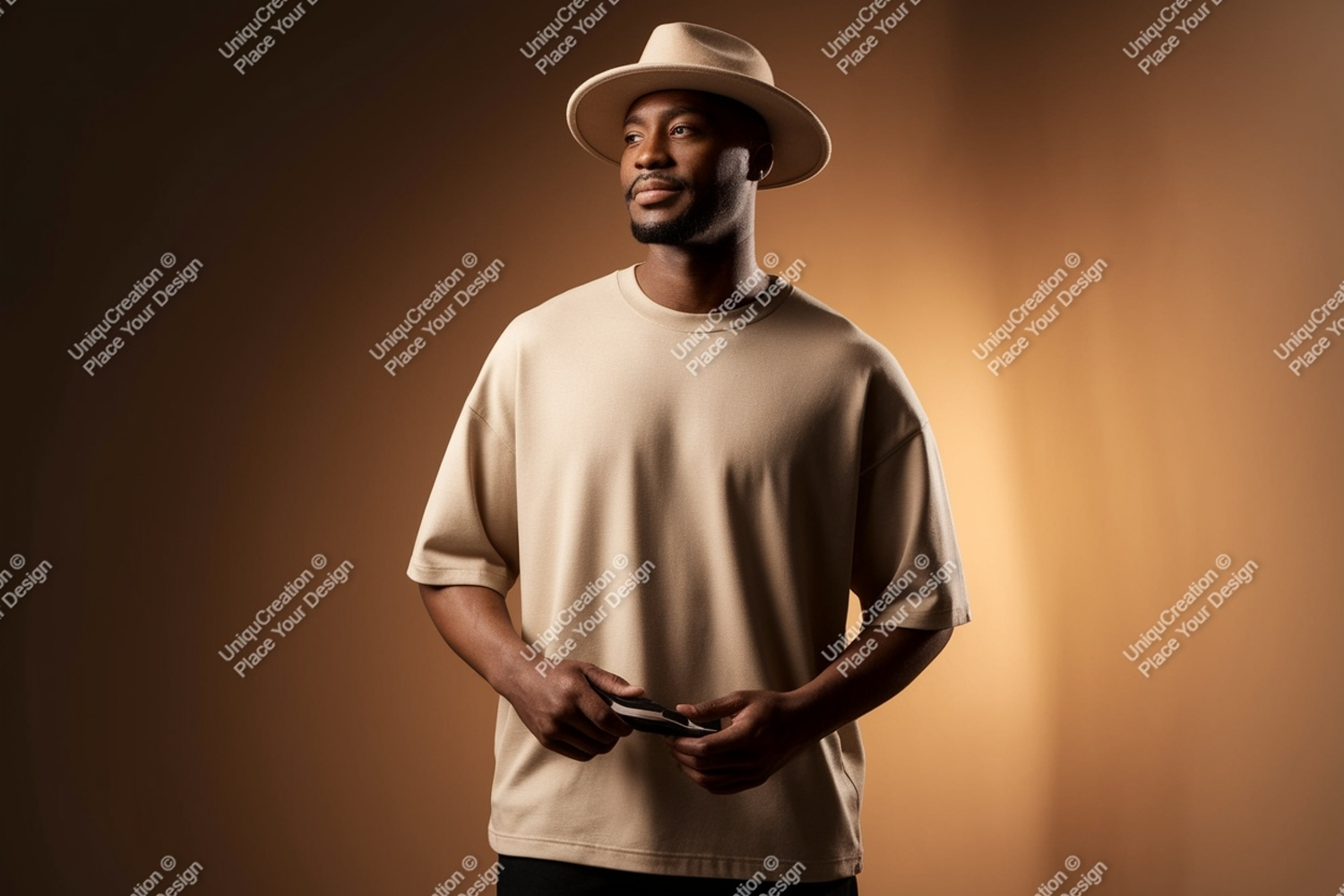 Fashion Man T-shirt Mockup Studio Beige Hat Portrait Holding Phone