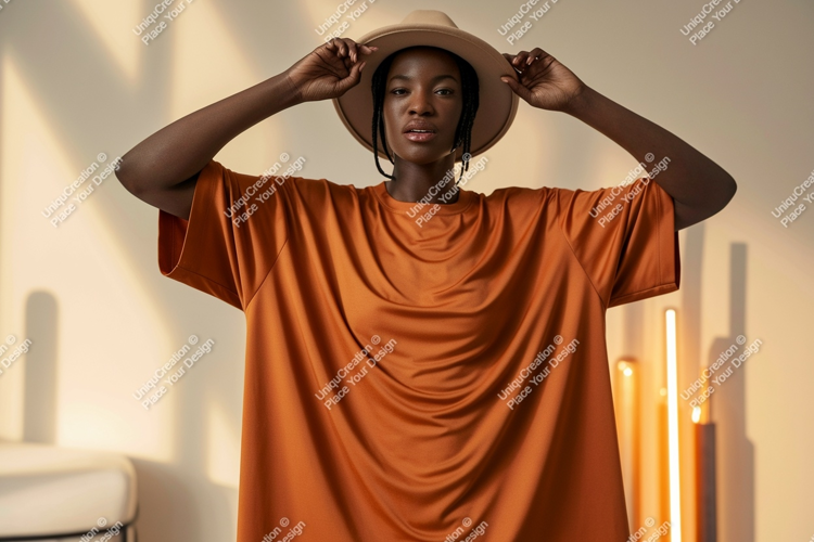Fashion Style Shirt Mockup Woman Model Studio Orange Hat Portrait