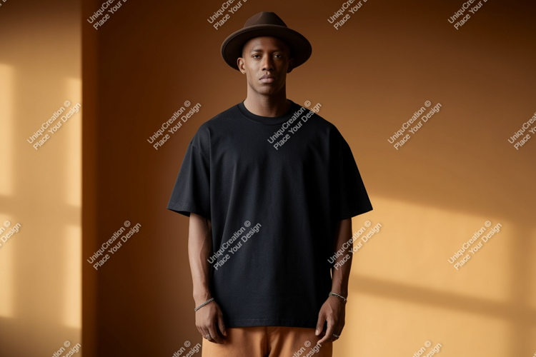 Fashion Man Black T-shirt Clothing Mockup Apparel Studio Brown Hat