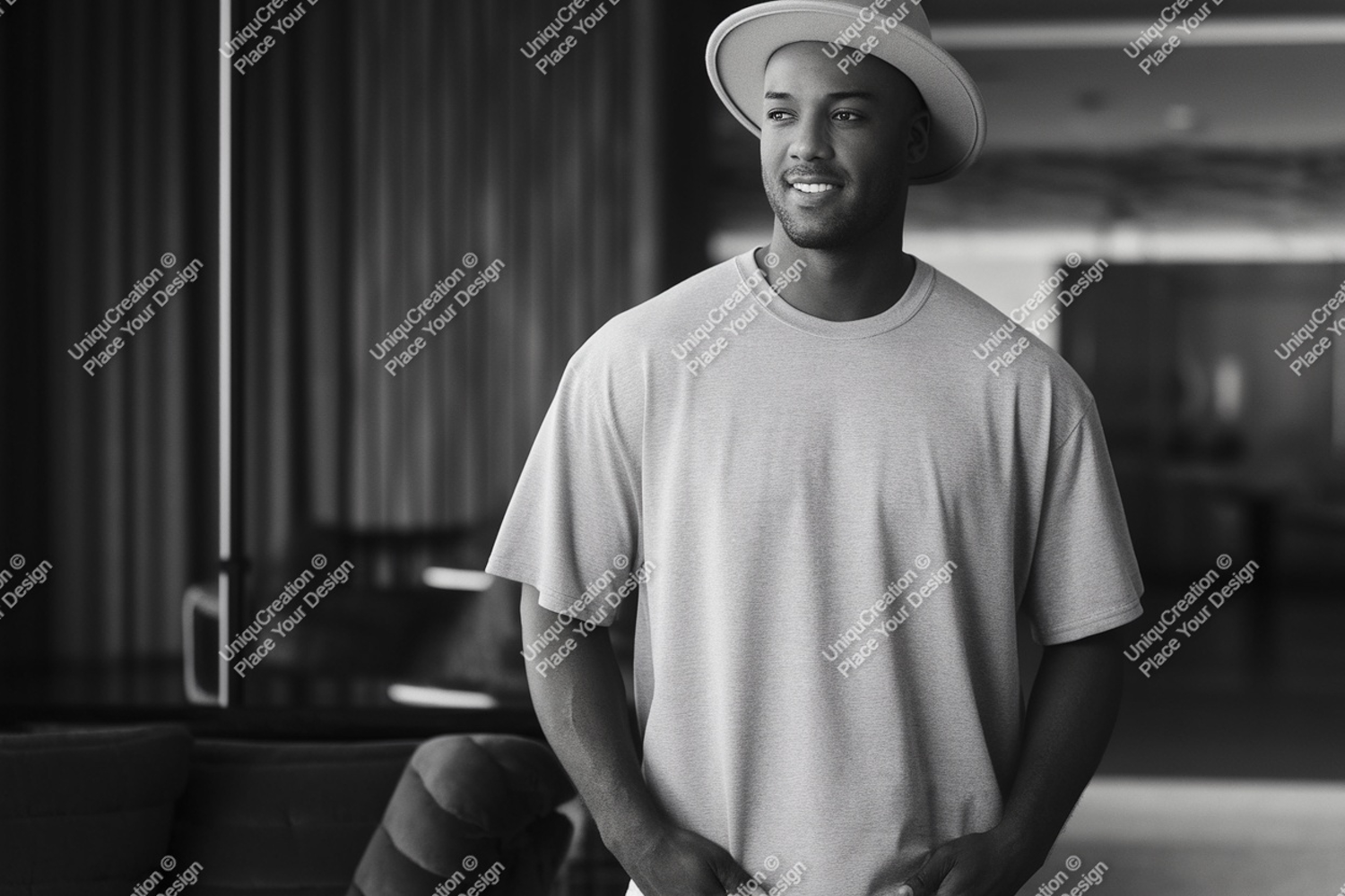 Man wearing light colored t shirt and hat t-shirt black example image 1