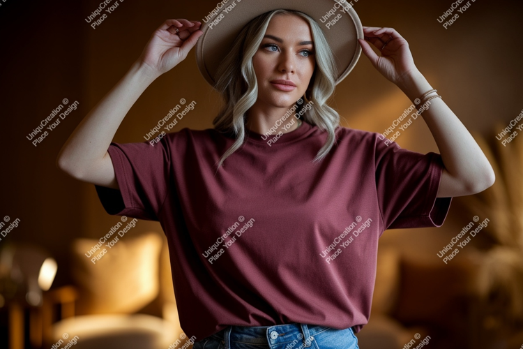 Woman wearing maroon t shirt and hat image example image 1