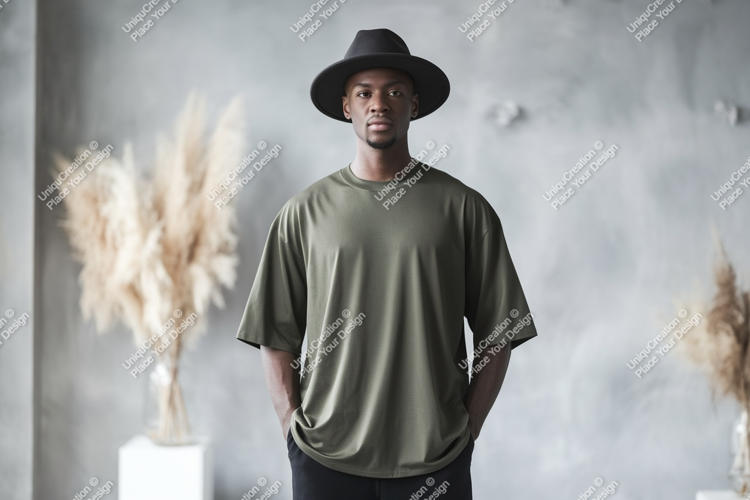 Similar Design Products to Man wearing olive green t-shirt and black hat image
