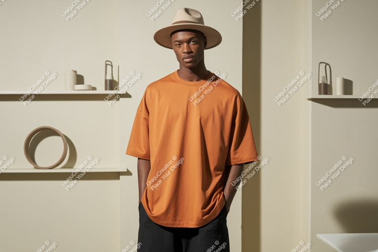Modern Fashion Man Shirt Clothing Mockup Studio Orange Hat T