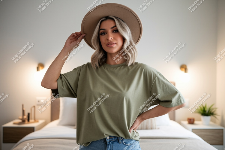 Fashion T-shirt Casual Green Mockup Woman Hat Olive Indoor Bedroom