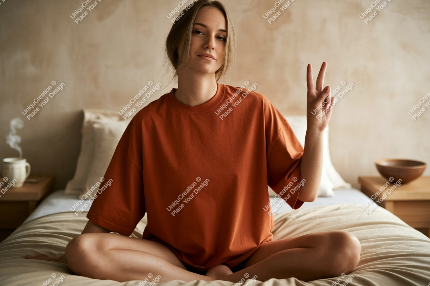 Shirt Casual Mockup Woman Peace Orange Bed Gesture Relaxed Bedroom